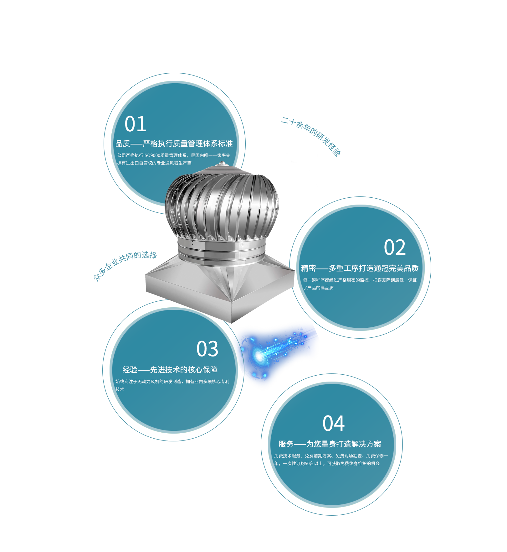 天長市通冠無動力風(fēng)機(jī)有限公司,是集研發(fā)、生產(chǎn)、銷售于一體的,專業(yè)無動力風(fēng)機(jī)生產(chǎn)廠家。公司坐落于205國道南京與揚(yáng)州之間,位于省級高新經(jīng)濟(jì)技術(shù)工業(yè)園,交通便利?!巴ü凇庇兄恢Ъ夹g(shù)精湛、服務(wù)非凡的隊伍。所有一線技術(shù)工人技術(shù)熟練、質(zhì)量意識強(qiáng)。公司嚴(yán)格執(zhí)行ISO9000質(zhì)量管理體系,一貫貫徹“以質(zhì)量為生命”、“以信譽(yù)為根本”、“以服務(wù)為基礎(chǔ)”的理念···[查看詳細(xì)]